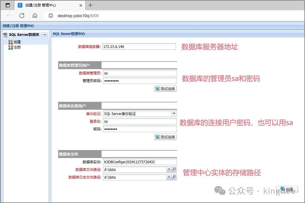 数据库服务器:数据库服务器的ip或者机器名。 数据库管理员用户:能连接数据库服务器的管理账号和密码,一般为sa。 数据库连接用户:能连接数据库服务器的一般账号和密码,可以同数据库管理员用户。 数据库实体:系统自动生成,该实体为管理数据库的数据库实体。 数据库文件路径:数据库实体存放的本地路径,点击搜索按钮会弹出数据库服务器的文件路径,根据自己的需要进行设置。 数据库日志文件路径:日志库存放的路径,默认设置成和数据库文件路径相同。 7、登录管理中心并创建数据中心。 管理库创建完成后,登录管理中心,管理中心登录账号密码默认为:Administrator\888888。
