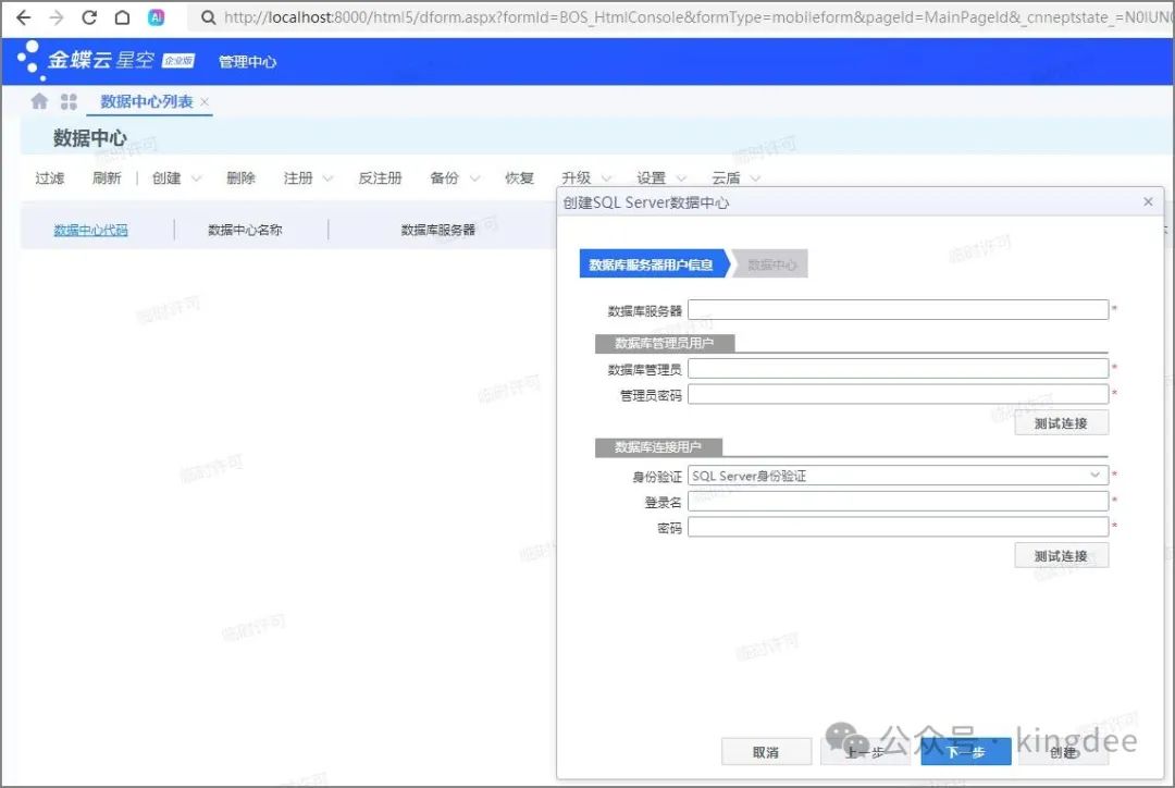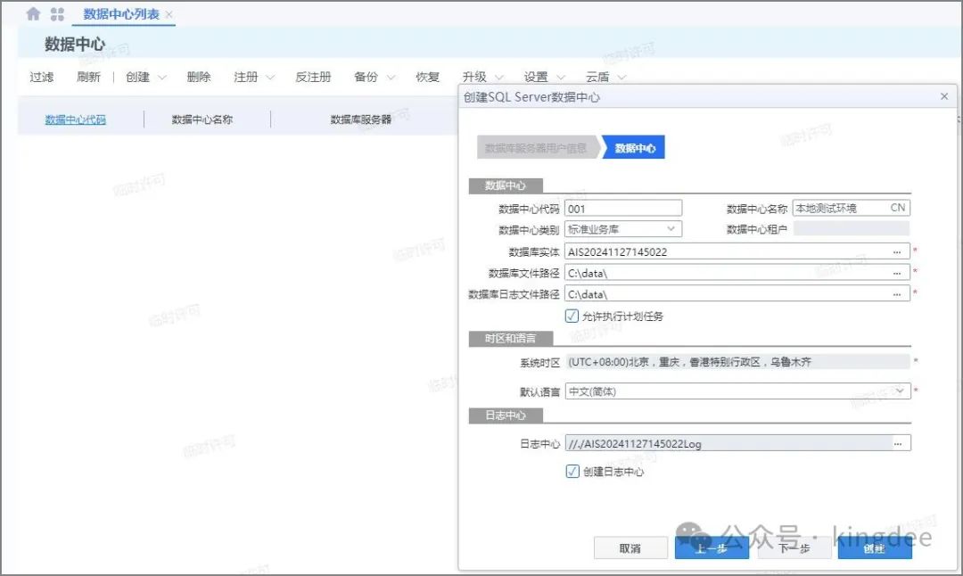 输入数据库服务器ip或者机器名,数据库管理员账号,数据库连接用户(可以同管理数据中心创建),下一步输入数据中心名称,选择数据库实体存放路径,进行业务数据中心的创建。