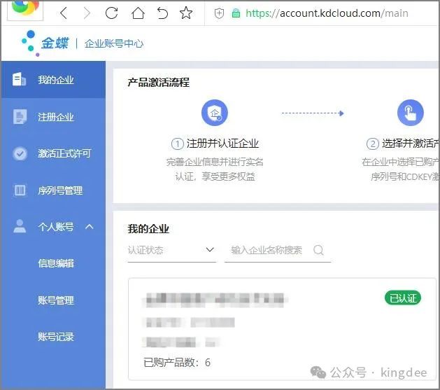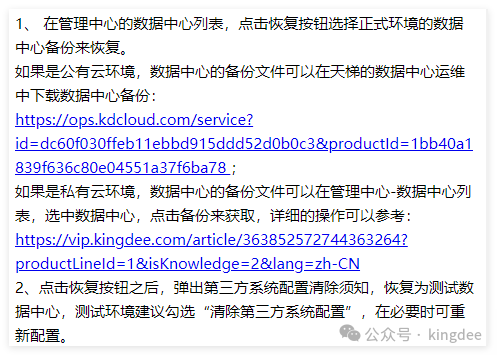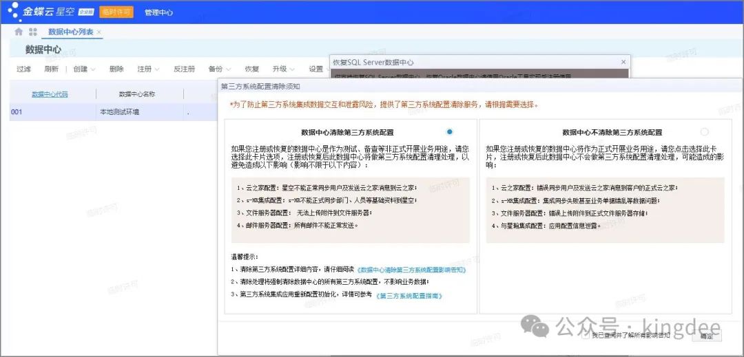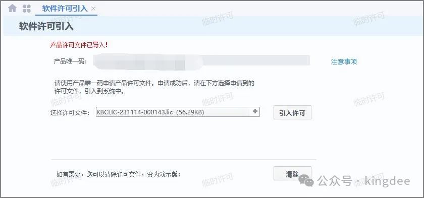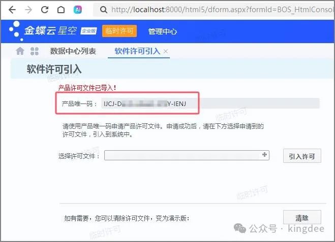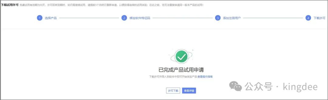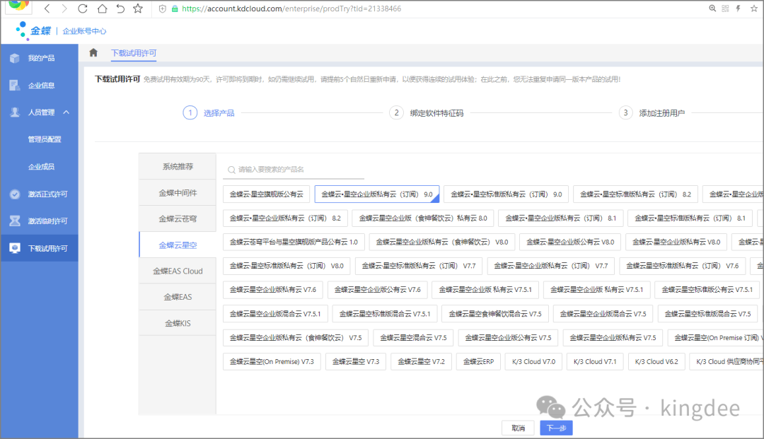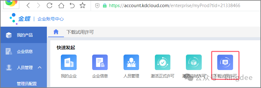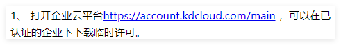 等待恢复完成之后,登陆客户端或者浏览器选择对应的数据中心访问。 4 申请临时许可并引入在云平台申请临时许可,但仅限3个用户,单次申请有效期3个月,申请时企业需要是已认证状态。 超过3哥用户的临时许可申请,请联系当地金蝶工程师协助。 获取3个用户的临时许可申请如下步骤: