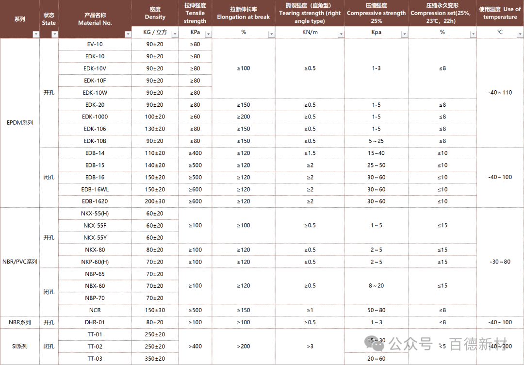 | EVA 泡棉 | 柔软弹性好,耐低温(-50℃),耐化学性一般,易染色 | | | |