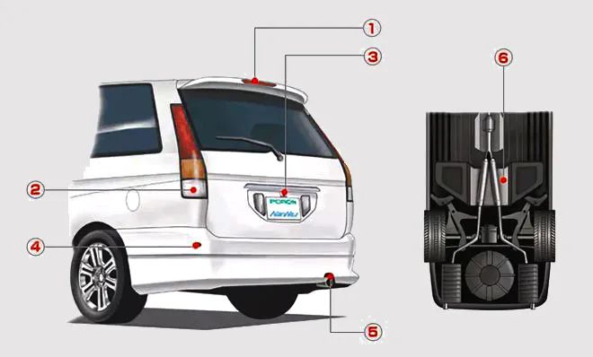 ① 车用闪光灯:防水、提高遮光性 ② 引擎盖隔壁:隔热、防噪音 ③ 引擎封条/电池封条:吸收震动、防止物体碰撞噪音 ④ 汽车前灯:防水、提高遮光性 ⑤ 雾灯:防水、提高遮光性 ⑥ 边角感应器&边角照相机:防尘、防水 汽车背部周边模切产品的应用 除了驾驶前之外,汽车的背部设计也非常重要。各种车灯,照明灯,感应器,照相机等耐水性,耐侯性的要求很严格。