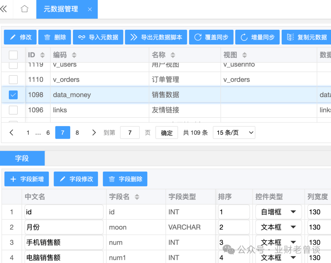 这一层里,元数据是关键点,因为业务永远是动态变化的,为适应这种动态变化,低成本、动态可配、低代码的元数据才是解决问题的方向。比如下面这种元数据管理: