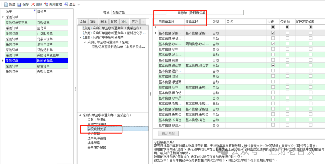 b.字段映射策略,即源单的A字段,映射到目标单据的B字段;