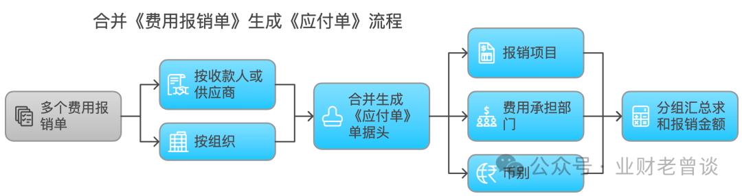 比如多个《费用报销单》,按同一【收款人 or 供应商】、【组织】合并生成1个《应付单》单据头,再用【报销项目(即转换后的费用类型】、【费用承担部门】、【币别】作汇总,汇总求和字段为【报销金额(价税合计)】;