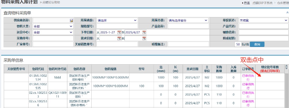 找到要绑定标签的采购订单明细行,双击点中最后一列 如下图: