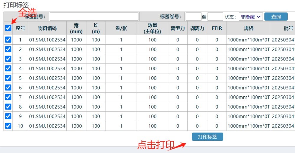 绑定完后,在上方全选,点击打印标签 如下图: 然后点击打印标签 如下图: