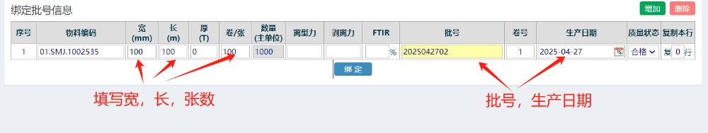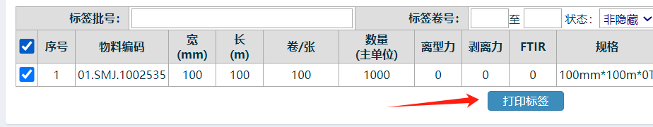 填上宽,长,批号,生产日期,片料有多少张,直接填在张数上即可 如下图: 最后点击绑定按钮 如下图: 绑定完后,在上方全选,点击打印标签 如下图: ![]() 然后点击打印标签 如下图: