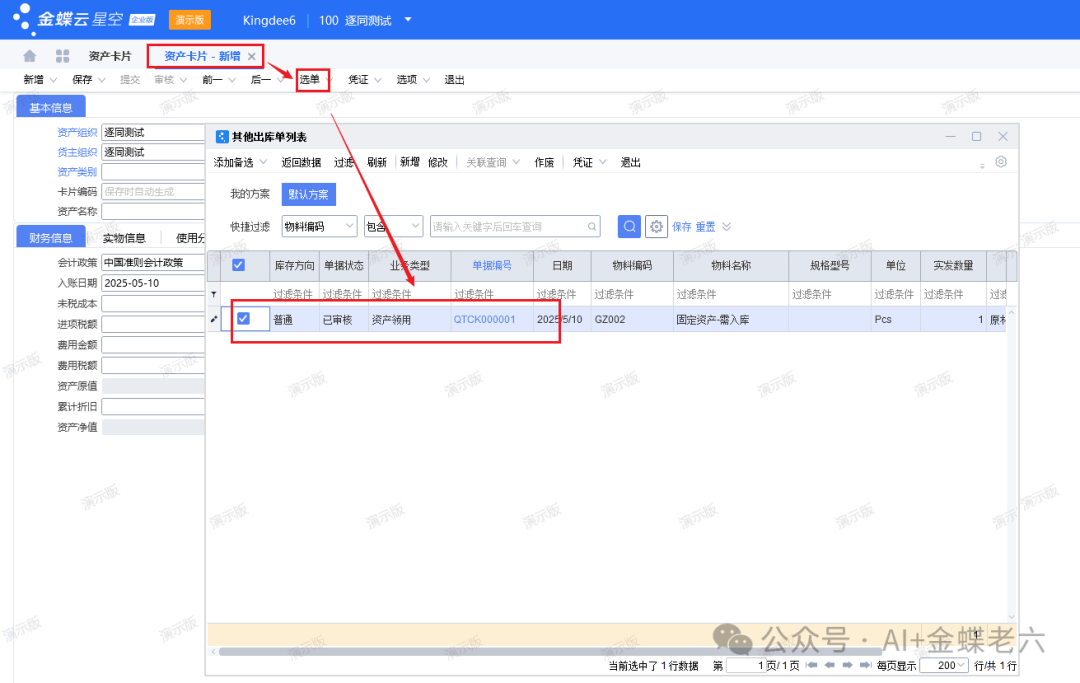 在【资产卡片】中新增卡片→选择资产类别→点击【选单】→选择【其他出库单】→关联其他出库单→填写信息→保存审核,如下图单所示。