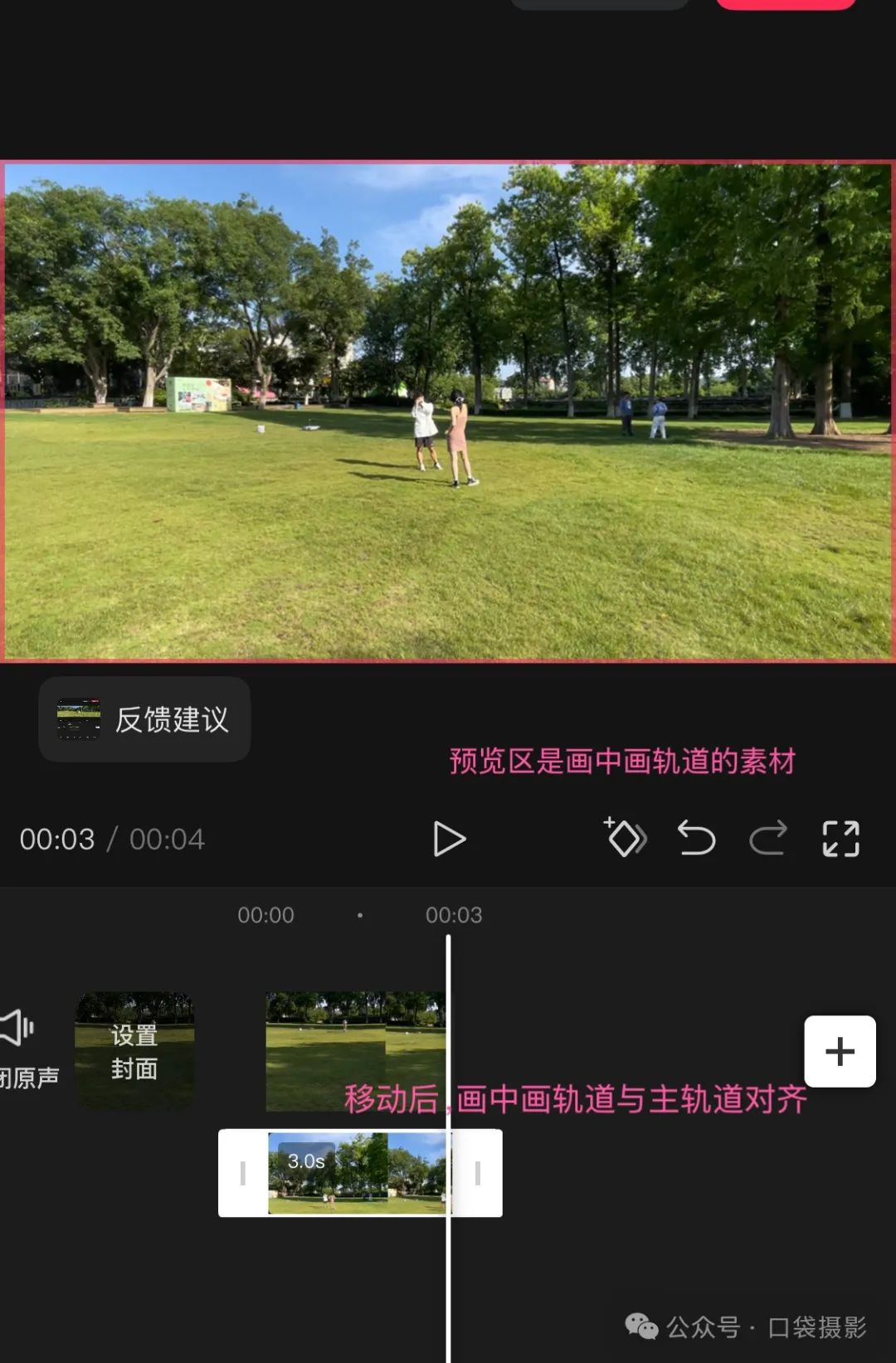 ![]() 2. 切入后,第二段视频素材将置于画中画轨道中 ![]() 3. 按住画中画视频素材向前拖动,此时轨道中就是上下两个视频图层,且画中画轨道的视频素材会覆盖住视频 ![]() ![]()