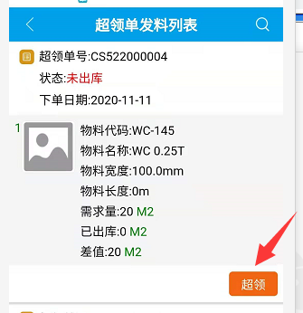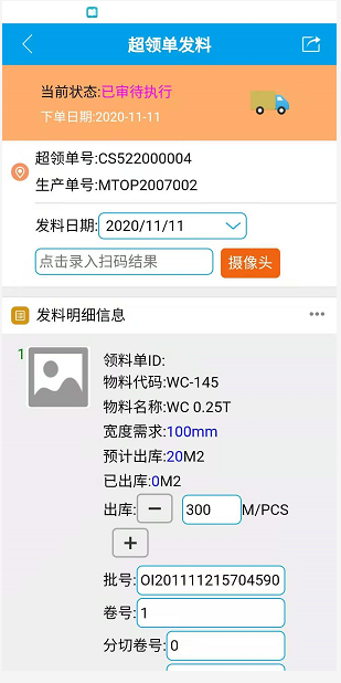 点击进入 如下图: 进入页面,核对超领单号,找到对应的单据,点击超领按钮 进入页面后,扫码需要领出的标签,扫描后点击发料按钮完成操作,如下图所示: 点晴模切ERP更多信息:https://moqie.clicksun.cn,联系电话:4001861886 该文章在 2025/5/17 11:49:14 编辑过 |