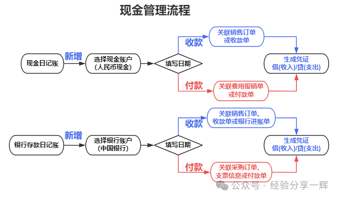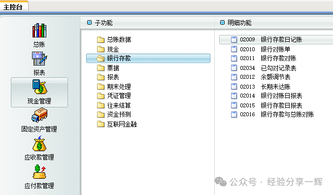 现金盘点单:核对实际库存现金与账面余额是否一致。 例如:现金2300元,100元面额,张数(23)。 注意:如果系统账面余额与实际现金不符,核对现金日记账是否漏记、错记。 现金对账:对比系统账面现金余额与实际库存现金是否一致,同时验证现金日记账与总账是否一致。 账实核对:(现金日记账VS实际现金) 点击(现金对账)--(新增对账)--选择(现金账户)--输入实际盘点金额(如2300元)--差异(为0)--直接确认;如果(不为0):检查(现金日记账)是否漏记、错记或清点现金错误。 账账核对:(现金日记账VS总账“库存现金”科目余额) 如果总账余额≠现金日记账余额,检查(总账凭证)是否遗漏或重复生成。 现金日报表:是现金日记账的每日汇总。 现金收付流水账:是现金日记账的明细。 银行存款板块