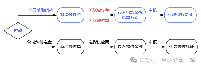 付款单:新增付款单--选择供应商--关联源单(应付单/预付单)--录入付款金额--选择结算方式(现金/银行转账等)--审核生成付款凭证。 预付单:新增预付单--选择供应商--录入预付金额--审核生成预付款凭证。 注意:付款单可勾选(使用预付款)关联(预付单)冲抵金额。 退款单
