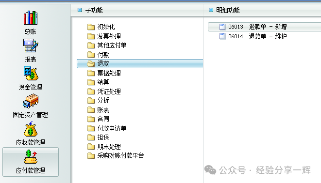 退款单:新增--选择供应商--填写退款金额、退款原因。(可关联原付款单或预付单,方便跟踪退款原因)--选择退款结算方式--保存审核--生成凭证。 结算(应付款核销)