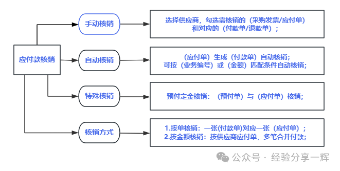 1.手动核销:选择供应商,勾选需核销的(采购发票/应付单)和对应的(付款单/退款单); 2.自动核销:直接(应付单)生成(付款单)自动核销;或者可按(业务编号)或(金额)匹配条件自动核销; 3.特殊核销:预付定金核销,(预付单)与(应付单)核销; 4.核销方式:(按单核销)一张(付款单)对应一张(应付单);(按金额核销)按供应商应付单,多笔合并付款; 账表(应付款报表)