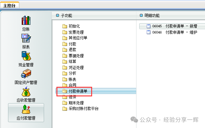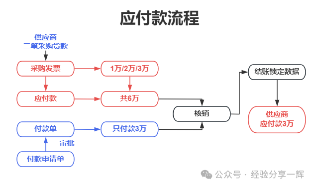 付款申请单:新增--选择供应商--关联(应付单)--审批通过后(部门经理审批/财务总监审批/老板审批)--系统自动生成(付款单)。 最后就是期末处理(结账)锁定数据 举个例子,走一下应付款流程 例如:公司有三笔向(供应商)采购的货款,总共为6万,只付款3万,还差3万没付款。操作流程如下: