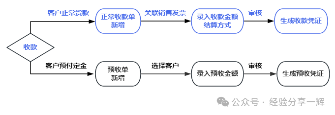 收款单:新增收款单--选择客户--关联源单(对应的销售发票)--录入收款金额--选择结算方式(现金/银行转账等)--审核生成收款凭证。 预收单:新增预收单--选择客户--录入预收金额--审核生成预收款凭证。 注意:收款单中也可勾选(使用预收款),关联预收款单冲抵金额。 退款单 向客户退回多收款项(如退货、价格调整等)。