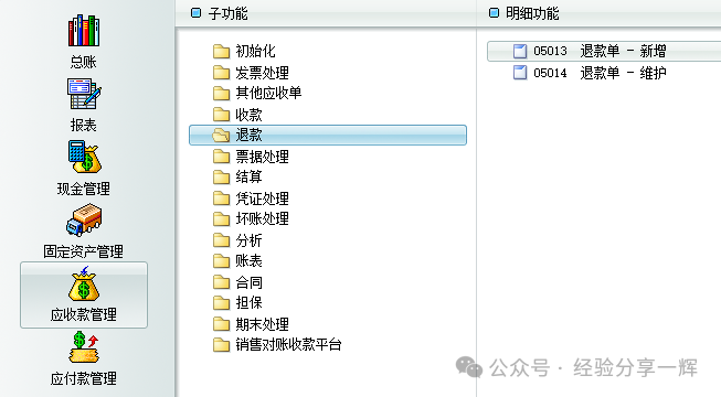 退款单:新增--选择客户--填写退款金额、退款原因。(可关联原收款单或预收款单,方便跟踪退款来源)--选择退款结算方式--保存审核--生成凭证。 结算(应收款核销) 应收款发票与收款单核销