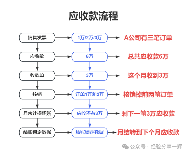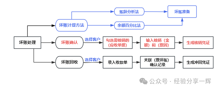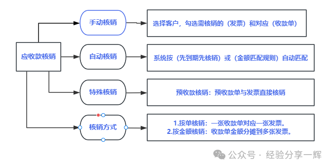 1.手动核销:选择客户--勾选需要核销的发票和对应收款单,输入(金额)--保存; 2.自动核销:系统可按(先到期先核销)或(金额匹配)规则自动核销; 3.特殊核销:预收款单与发票直接核销(无需收款单); 4.核销方式:按单核销(一张收款单对应一张发票,用于明确指定收款的场景)。按金额核销(同个客户,收款单金额分摊到多张发收票,用于公司月结的场景); 坏账处理
