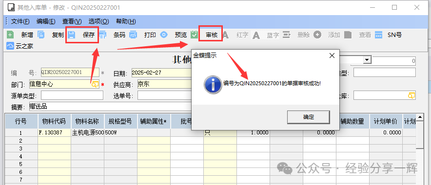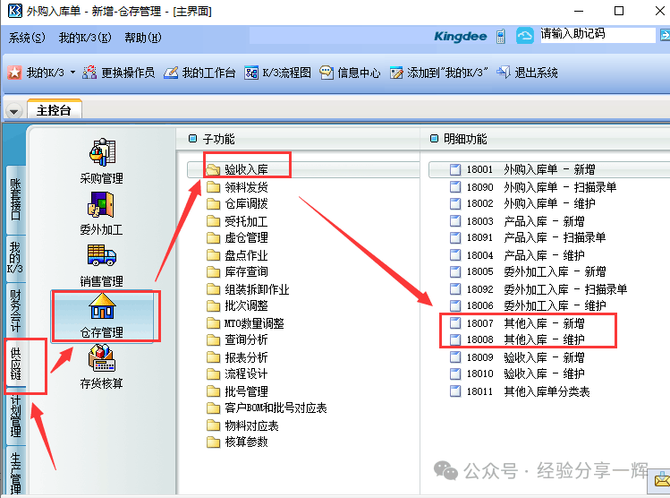 先讲个简单版本的操作,具体和自己的公司流程有关。 仓库入库流程: 正常采购的物品,走采购流程(采购申请单)——(采购订单)——(外购入库单)具体操作,看从零开始学金蝶k3(一)(采购入库篇) 有些赠送的物品,没价格的,我们一般是走(其它入库单)入系统仓库,这样可以直接区分出物品来源,也可走采购入库流程,入0元的价格,这个看自己公司怎么操作。 仓库出库流程: 先是领用部门走个(领料或领货)流程,看自己公司怎么规定,有的是走纸质单,部门领导签名,再去(仓库)领东西;有的公司走OA单(钉钉、企业微信等),审批完后,直接去(仓库)领东西。仓库出库后,金蝶k3系统,录个(其它出库单),物品出库完成。 金蝶k3(其它入库单)操作 举例:我们还是用上节讲的物品(主机电源500W :编码F.130387),入库1个电源。 供应链——仓库管理——验收入库——(其他入库-维护)