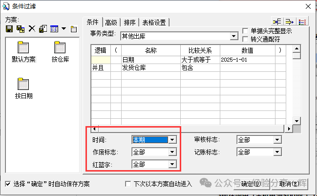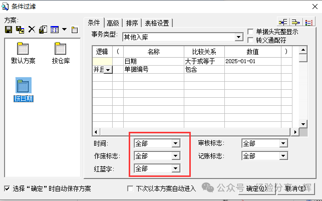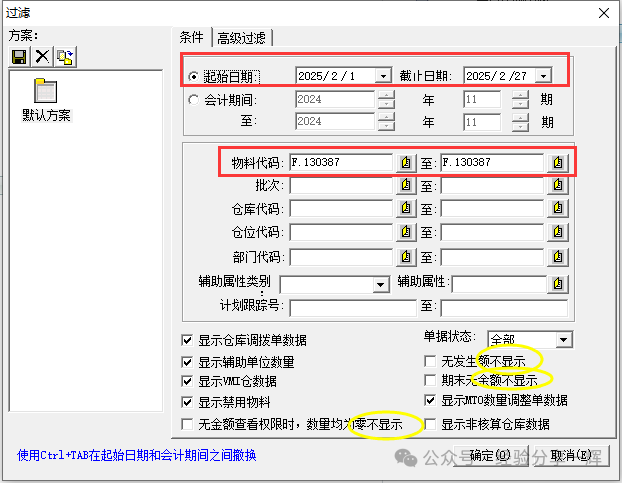 举例:查询物品(主机电源500W :编码F.130387),二月的明细。过滤条件:选日期和物料代码,这样查询出来最快最简洁。注意:下面三个(不显示)不要勾选,不然有时查询的数据会不全。