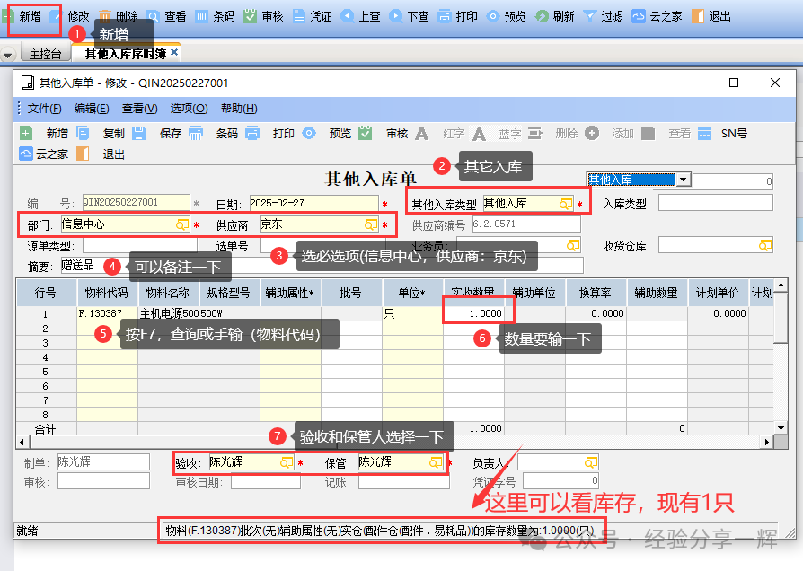 在维护介面,新增(其他入库单); 其他入库类型:其他入库; 选必选项:部门和供应商; 摘要:可以备注一下信息; 物料代码:按F7查询,或直接手输代码; 实收数量:填一下(入库1个); 验收和保管人:选择一下; 备注:最下面这里会显示该物品的库存。