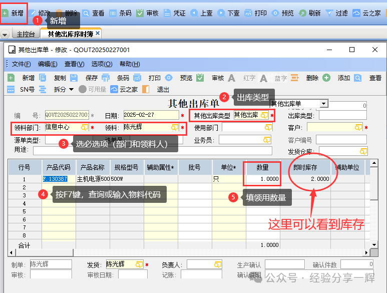 维护介面,新增(其他出库单); 其他入库类型:其他出库; 选必选项:部门和领料人; 用途:可以备注一下信息; 物料代码:按F7查询,或直接手输代码; 领用数量:填一下(领用1个); 即时库存:显示该物品的库存; 发货人:选择一下;