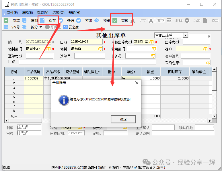 保存——审核,单据生效,现在库存变1个,出库完成。