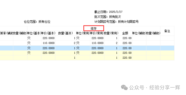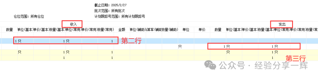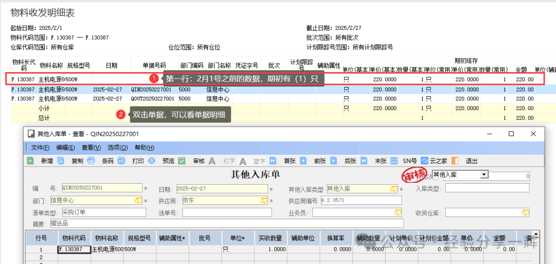 报表怎么看: 第一行:显示期初数量,显示2月1号,系统库存(1只)。 第二行:单据(QIN20250227001),可以双击单据,显示明细;(第二行双击后,出现单据明细:其他入库单) 第三行:单据(QOUT20250227001),双击可以看明细;