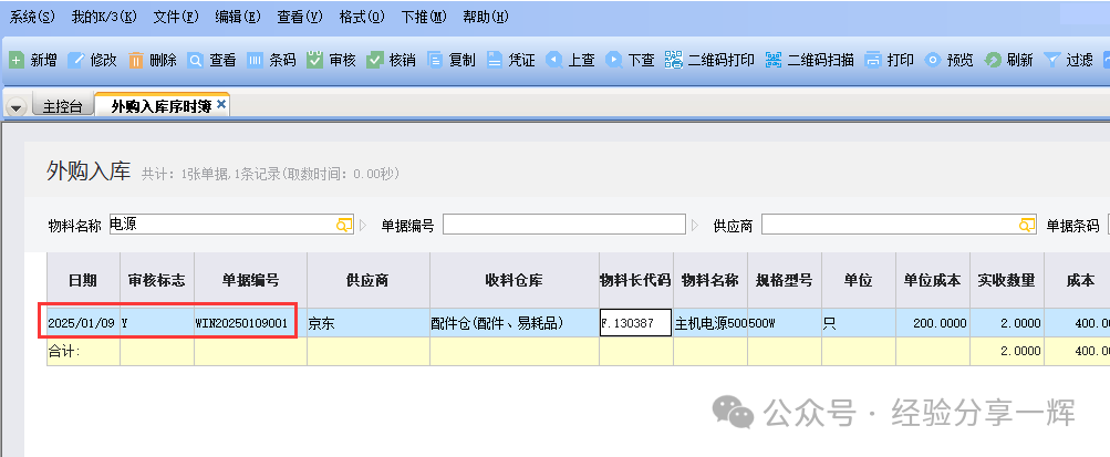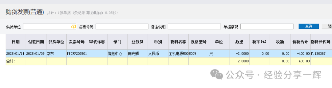 我们再查外购入库单,系统就有一张(负数的单据)