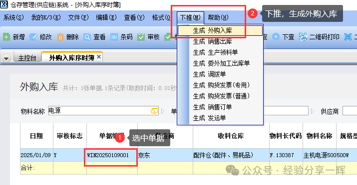 02:做红字的外购入库单,退货退发票 最简单的操作方法:找到并选中要退货的单据,点上面的(下推-生成外购入库)