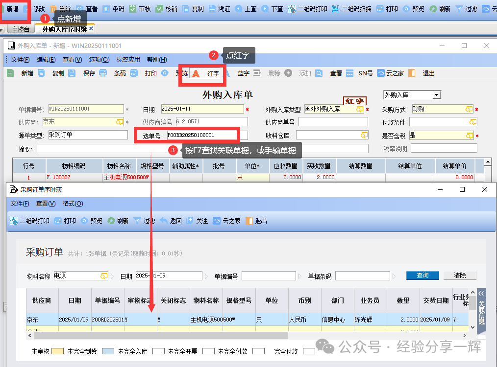 第二种方法:新增(外购入库单)——(选红字)——关联单号(在选单号这里按F7查询关联的单据,或手动输入单号)——(保存)——(审核)单据。 注意:退货的单,要选(红字) 此方法比直接(下推-生成外购入库)的方法多了两步,1是选(红字),2是手动关联单据或手输单据。