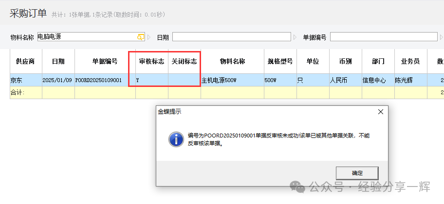关闭成功后,此时单据的关闭标志为(Y),单据流程结束。