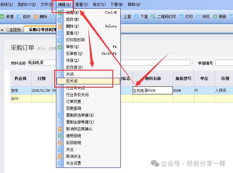 我们也可以选中单据,选上面的(编辑)——(关闭/反关闭)。功能一样的。