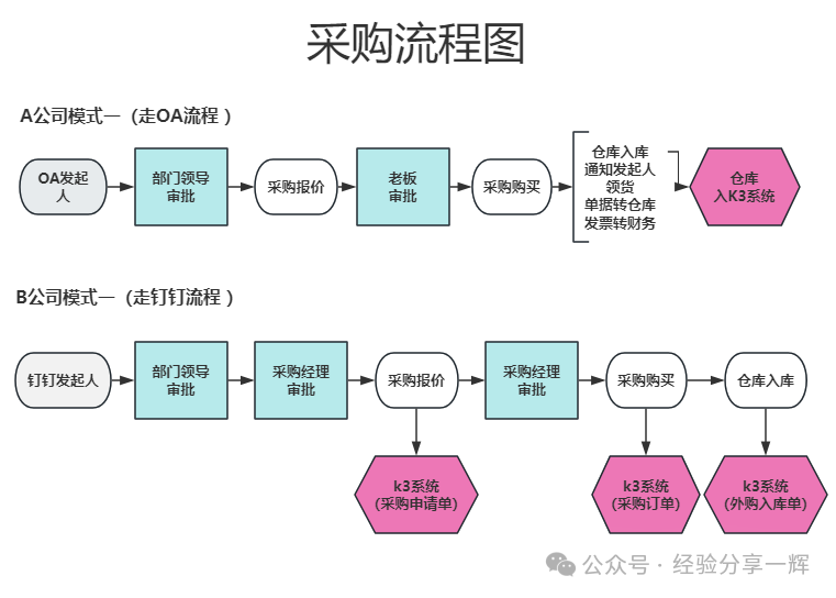 采购入库篇 分三部份讲解: 1、讲解公司的采购流程。 2、讲解金蝶k3的采购流程。 3、讲解金蝶k3的实际操作。 一、公司采购流程 每个公司的采购流程都有所不同,我们例举两个公司来讲解一下。在图中我们可以看到:
