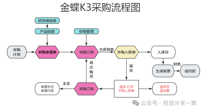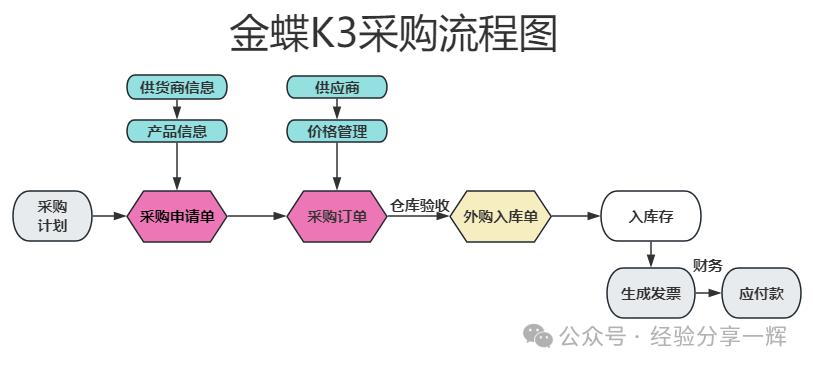 A公司的采购流程:直接走OA审批,老板审批完后,采购购买,货物到仓库后,仓库人员录(金蝶k3)系统,全程采购不需要操作(金蝶k3)系统,只需要据OA系统,做好采购工作就可以了。 B公司的采购流程:走的是钉钉审批流程,采购在报价时,要填写金蝶k3系统的(采购申请单);在购买时,填写金蝶k3系统的(采购订单);到货后,仓库人员验收货物,填写金蝶k3系统的(外购入库单);把金蝶的采购入库分成几个人来操作。 我们了解自己公司的采购流程就可以了。 二、金蝶k3的采购流程