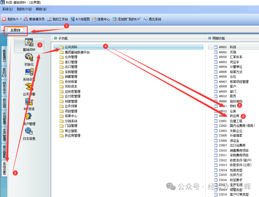 金蝶k3系统的采购流程是这样的,举个例子,我们要在京东采购两个电脑500W电源,录(采购申请单)时,我们要填写(产品信息)。流程到采购订单时,我们要填写(价格)和(供货商信息)。到货后,仓库验货,填写(入库单),没有问题就产品入库存,生成记账发票,结束采购流程。 如果产品有问题,要退货,仓库再填一张(红色的入库单),退库存和记账发票,单据回到采购订单状态,采购重新购买,再走一次入库流程,或者不买了,采购关闭单据,结束采购流程。 注意:金蝶k3系统的单据,分为红字和蓝字,蓝字为正数单据,红字为负数单据。(正常流程是蓝色字单据,退款退货之类的是红色字单据) 三、金蝶k3的(采购入库)实际操作 还是一样,举个简单的例子:要在(京东平台,采购两个,电脑500W电源,价格是200元/个),开始我们的表演。 第一、确认有物品和供应商的代码 要在k3系统找到两个信息,供应商(京东),物品(电脑500W电源),如果没有,我们要自己录一个。 打开k3系统,进入(主控台)——(系统设置)——(基础资料)——(公共资料)——(物料和供应商)