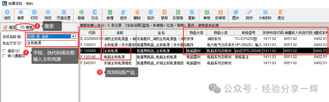 我们在这里可以看到,产品代码是(F.130)开头,物品的(大类)和(小类),产品(存货科目),(收入),(成本),的归类等信息,如果我们自己新增,不了解物品的核算归类,很容易搞错,到时会影响后面的财务报表。 所以我们最好是找到同类产品,双击进去,(复制)一个同类产品,修改名称,修改一些你自己知道的参数,一些不了解的参数,不用改,和同类产品一样就好。