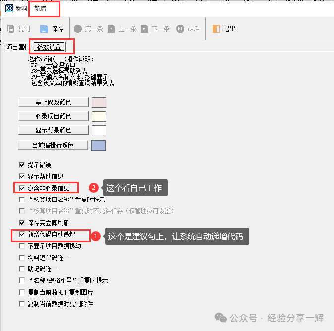 注意:新增这里的参数设备 新增代码自己递增建议(勾上),隐含非必录信息这个看自己工作需求,设置完记的点保存。