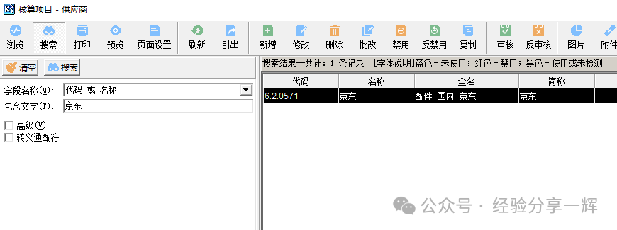方法一样,在(主控台)——(系统设置)——(基础资料)——(公共资料)——(供应商)——(管理)——搜索(京东)。 一般公司的供应商都固定有的,不用新增,用旧的就好,这样财务的账才不会乱。