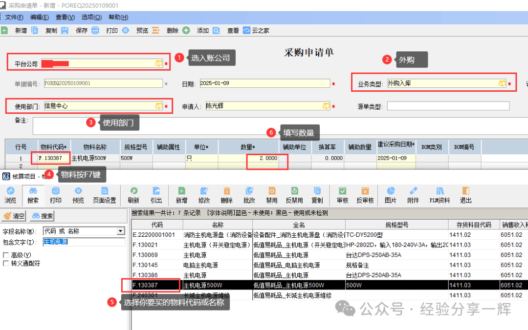 填写采购申请单,选(公司),业务类型(外购入库),使用部门(信息中心),物料代码(按F7键,查到并选择要购买的物料代码或名称),或者知道代码,自己(手输代码),数量(记得填一下)。