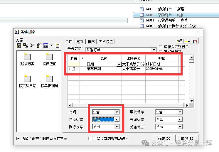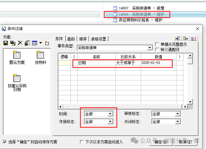 再讲一下(采购申请单-维护)的功能,点维护,弹出过滤条件。一般我们按日期查(例如:日期,大于或等于,2025-01-01),下面时间和标志,记的选(全部),不然有时会查不到我们想要的单据。