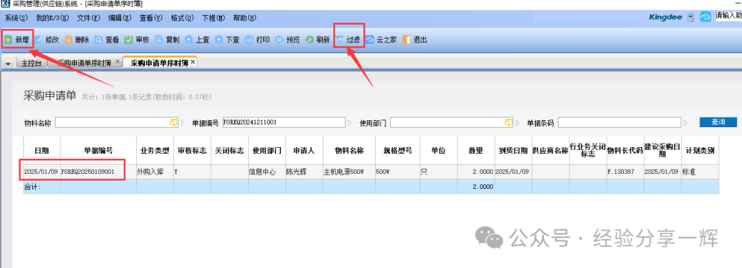 这是会显示我们刚刚查询条件的所有单据,点(新增)就是(采购申请单)功能,点(过滤)就是(修改查询条件)功能,双击单据就是(打开和修改单据)功能。在这里可以查看并新增或修改单据。
