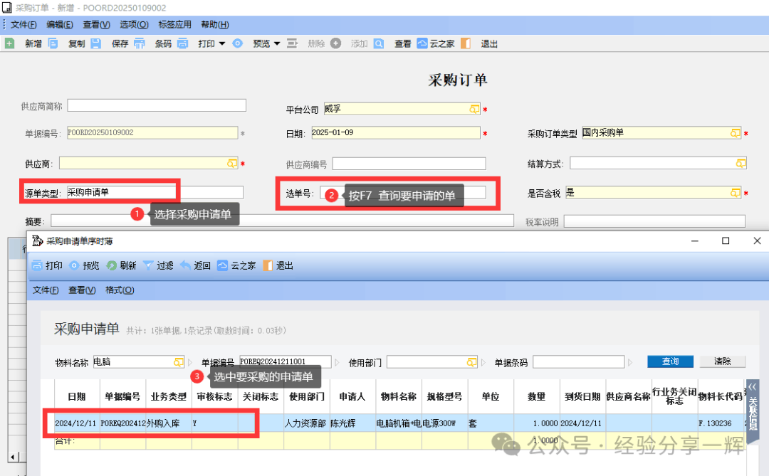 关联采购申请单后,还要填写几个关键选键选项,供应商选择(京东),选择采购类型(国内买的选国内采购),填写价格(200),有黄色的为必填项。