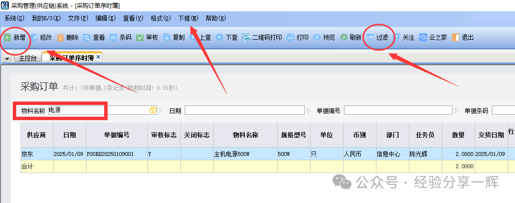 同样,进去后有(新增),(审核),(查询过滤),(下推)等功能,和采购申请单的功能一样。