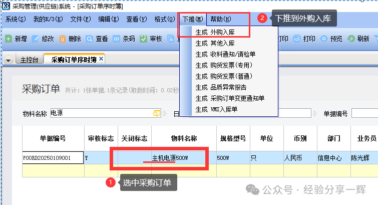 第四、从(采购订单)到(外购入库) 同样,我们直接在(采购订单-维护)里面,选择单据,点上面的(下推--生成外购入库),这样快点。