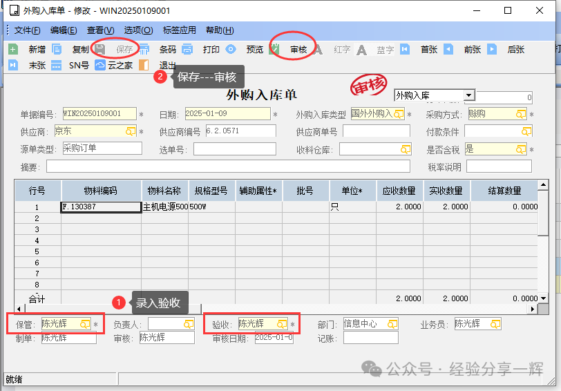 同样,填完后记得保存,审核。采购订单完成,单据到入库流程。这是最方便的流程。