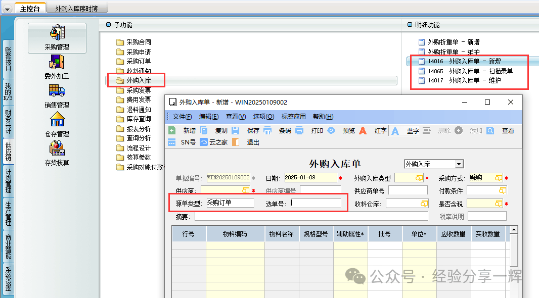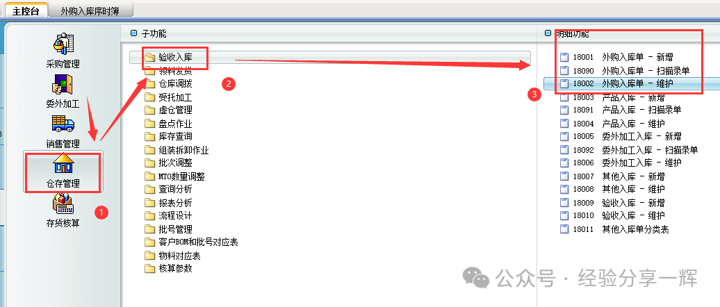 还可以从主控台,(仓存管理)——(验收入库)——(外购入库--新增/维护),功能是一样的,只是打开路径不同,这里也不重复讲解了。