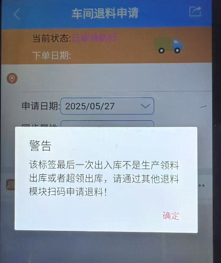 点晴模切ERP-弹出提示:该标签最后一次出入库不是生产领料出库或者超领出库,请通过其他退料模块扫码申请退料!