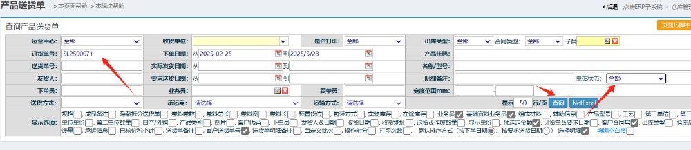 输入订货单号,和状态选全部,再点击查询 如下图: