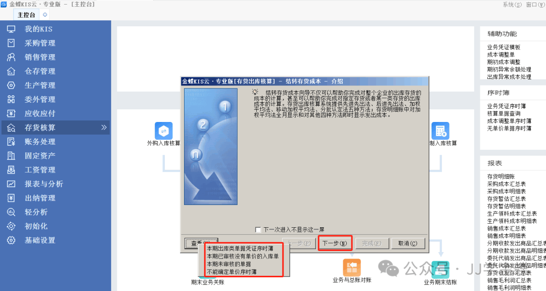 - 核算步骤: - 点击“下一步”,分别可以结转本期所有存货的成本、指定存货类、指定存货代码段和指定单据。省事点直接选择“结转本期所有存货”。